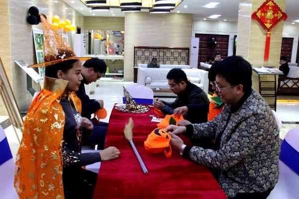 一走進(jìn)營銷大廳,迎面而來的是各種笑容可掬的南瓜燈,各種精靈搞怪的造型,烘托了濃重的萬圣節(jié)日氣氛;身著搞怪裝飾的工作人員為來客送上各種精品小禮物,有南瓜兜DIY,拿起針線親自手工縫制一個南瓜布袋,體驗(yàn)節(jié)日的歡樂,有精美甜點(diǎn),在愉快勞動的同時犒勞你的味蕾。